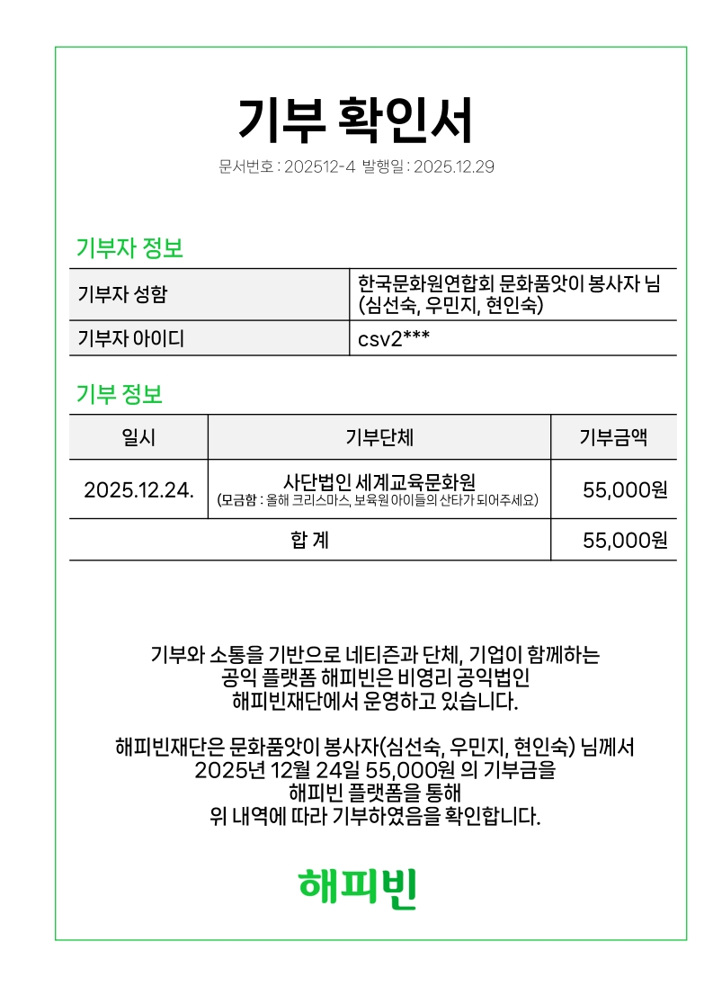 2025 문화품앗이 봉사자님들의 마일리지가 해피빈으로 기부되었습니다