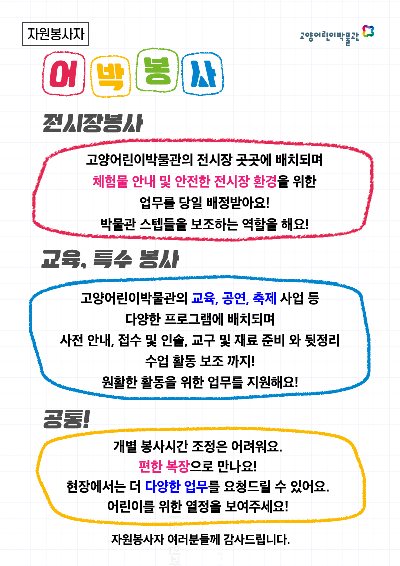 | 주요사업내용 | 고양어린이박물관 문화 교육 프로그램(어린이 또는 성인 대상) 준비 및 진행 보조 역할 수행하는 봉사자 모집 예정추가로 어린이날 축제 및 연말 프로그램 체험 운영 보조 역할 수행하는 봉사자 모집 예정 | ||